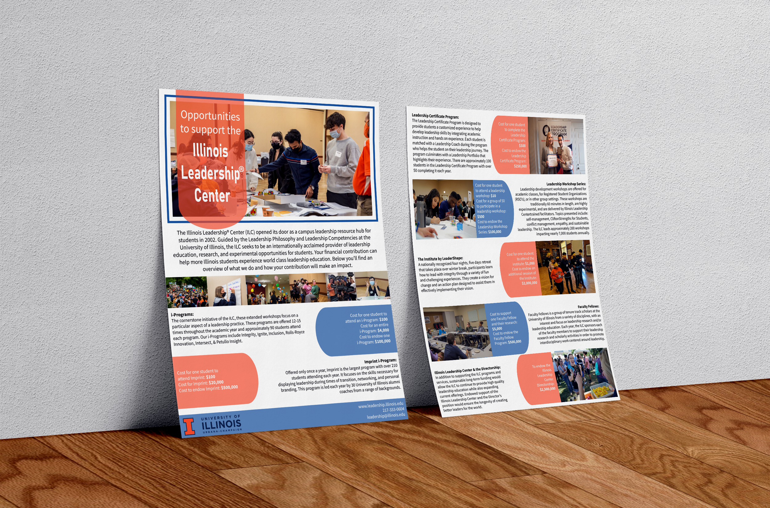 Each year, the Illinois Leadership Center undertakes fund-raising initiatives to ensure the office's financial sustainability for the next year. I had the exciting opportunity to create an engaging 8.5x11-inch infographic that would be shared with alumni and supporters. The challenge was to strike a balance between fun and professionalism. Following the University's brand guidelines, I opted for lighter colors to keep printing expenses cheap. The infographic would entail a significant amount of text, but the ILC also wanted to highlight numerous event photos. This way, donors could visualize the impact of their contributions. To keep all the information organized, I incorporated pictures and used colors strategically. It was an enjoyable task that allowed me to bring the fundraising efforts to life through visuals and storytelling.